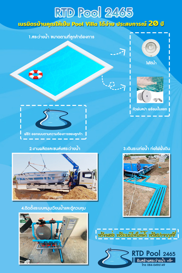 - ต้องการรูปแบบสระที่ สวยงาม หรูหรา และเราสามารถ กำหนดและออกแบบขนาด รูปทรง ความลึก ได้เอง หรือ รูปทรง ขนาด ของสระไฟเบอร์กลาส ไม่ตรงกับความต้องการของคุณ RTDPool2465บริษัทรับสร้างสระว่ายน้ำ